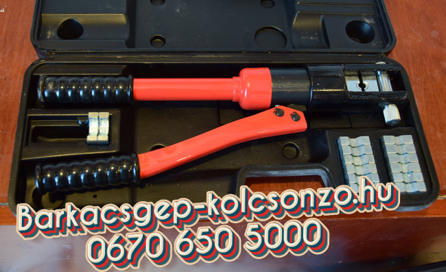Egy napra: 4 000 Ft Több napra: 3 000 Ft/nap Kaució: 10 000 FtKábelprés 8 féle különböző pofával. A legkisebb 10mm2 vezetékhez való, de növekvő sorrendben 16, 25, 35, 50, 70, 95 és 120-as a legnagyobb méret amivel ez a kézi hidraulikus prés megbírkózik.