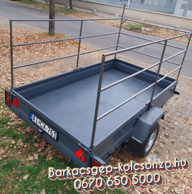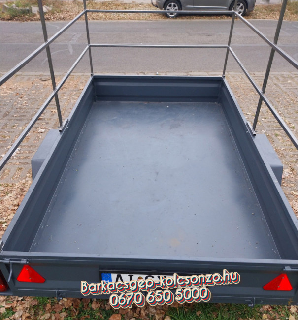 Ezen utánfutónk is magyar gyártmányú és mi újonnan vásároltuk. Ennek előnye sok olcsóbb külföldi utánfutóval szemben, hogy zártszelvényekből van hegesztve az alváza és a felépítménye is, szemben a sok U és C profilokból össze szegecselt gyengébb minőségű utánfutóval. Ennek egy pici hátránya a kicsivel nagyobb önsúly, de a masszívabb felépítés és a jobb minőség úgy gondoltuk bőven kárpótol minket is és a bérlőinket is ezért a pici hátrányért. Másik nagy előnye ennek a kölcsönözhető utánfutónak a futóműve. Sok olcsó futó futóművében torziós rugó található, amelyben van néhány előnye, de könnyebben tönkre tud menni. Emiatt mi a laprugós felépítést választottuk. Szemben a régi klasszikus laprugós futóművekkel, ebben lengéscsillapító is található a laprugók mellett mindkét oldalon, amely miatt jelentősen javul az utánfutó úttartása, kényelmesebb vontatni. A picivel nagyobb önsúlynak is van előnyös tulajdonsága az úttartásra, főleg üresen vontatvan, ugyanis a súlya miatt kevésbé pattog az úton a jármű.